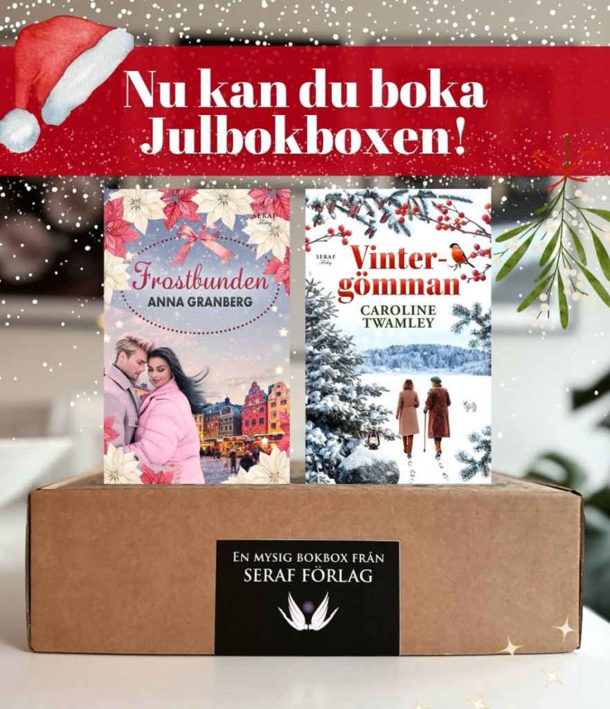 Nu kan du boka årets julbokbox hos Seraf förlag! 🎁🎅🏻🎄 Boxen innehåller signerade ex av två mysiga, feelgoodiga julromaner – min nya bok Frostbunden och Vintergömman av Caroline Twamley⁠ – plus utvalda bokliga och juliga överraskningar: