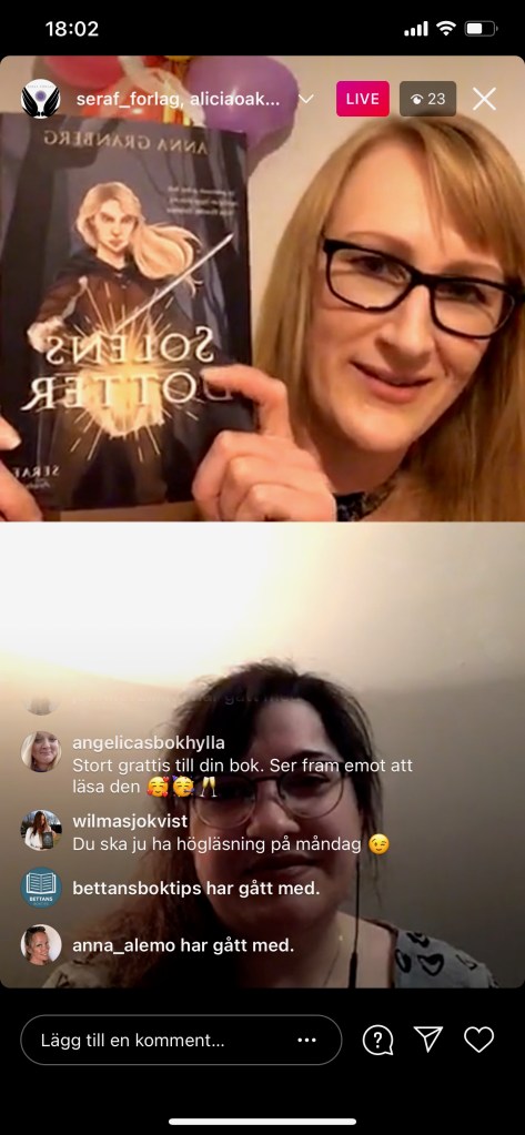 Den 27 februari släpptes Solens dotter och jag firade med en livesänd digital release på Seraf förlags Instagram. Jag hade sällskap av två spännande författare: Alice Ekström, som bl.a. skrivit fantasyromanen Maskeradnatten och som också illustrerat det häftiga omslaget till Solens dotter och är blurbad (citerad) på framsidan, och Emelie Beijer, som släpper sin nya urban fantasy-bok Dömd för evigt på Seraf förlag om en månad. Tyvärr misslyckades jag med att spara sändningen efteråt, så den går tyvärr inte att se i efterhand.