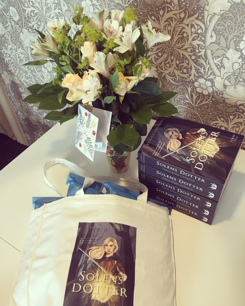 Signerar och packar böcker så att det står härliga till! Dags att gå till posten igen. En ny liten laddning böcker på väg ut till läsare! Perfekt att ha en egen tygkasse att bära i. Den fantastiska blombuketten fick jag av mina svärföräldrar med grattishälsning till boksläppet.Ännu en laddning böcker signerade och på väg ut till läsare runtom i landet, och en till vårt grannland Finland. Jag har också en som ska till Italien, så snart kan jag ju nästan kalla mig internationell författare. 😜😂 De underbara blommorna i soliga färger fick jag med bud på releasedagen från min fina vän och testläsare Jouleen med fästman.